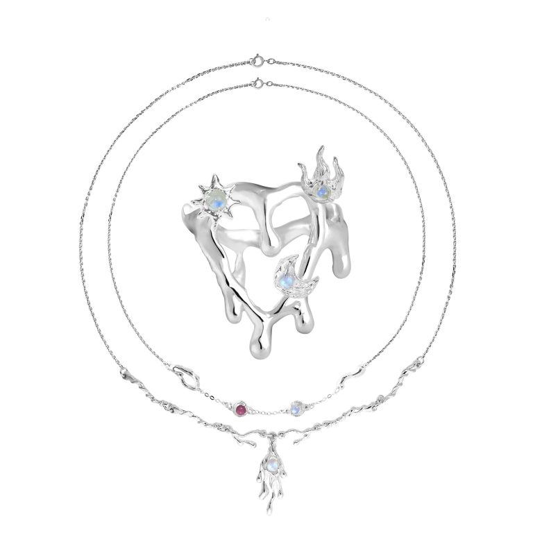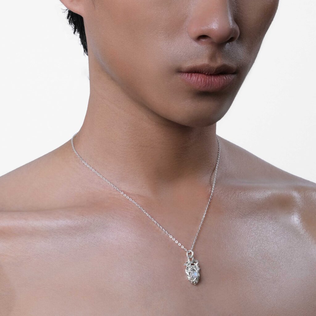 The Human Heart Pendant is crafted from 925 silver and adorned with a natural moonstone, capturing the rhythm of emotion and light.