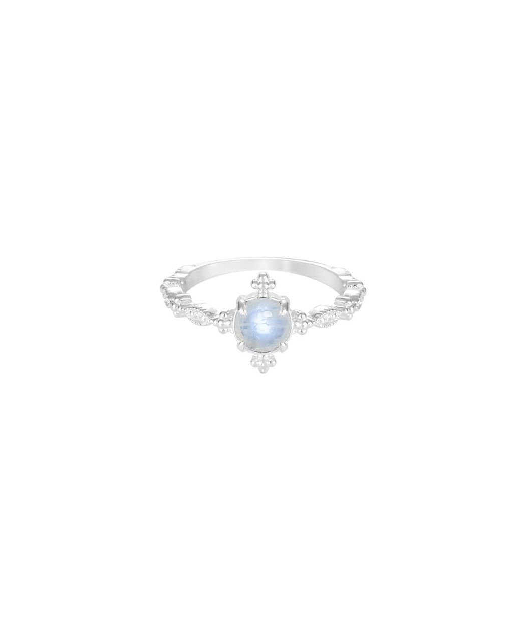 The ‘Snowflakes’ ring: an intricate silver design with a central moonstone in a sparkling snowflake setting. A unique piece inspired by winter.